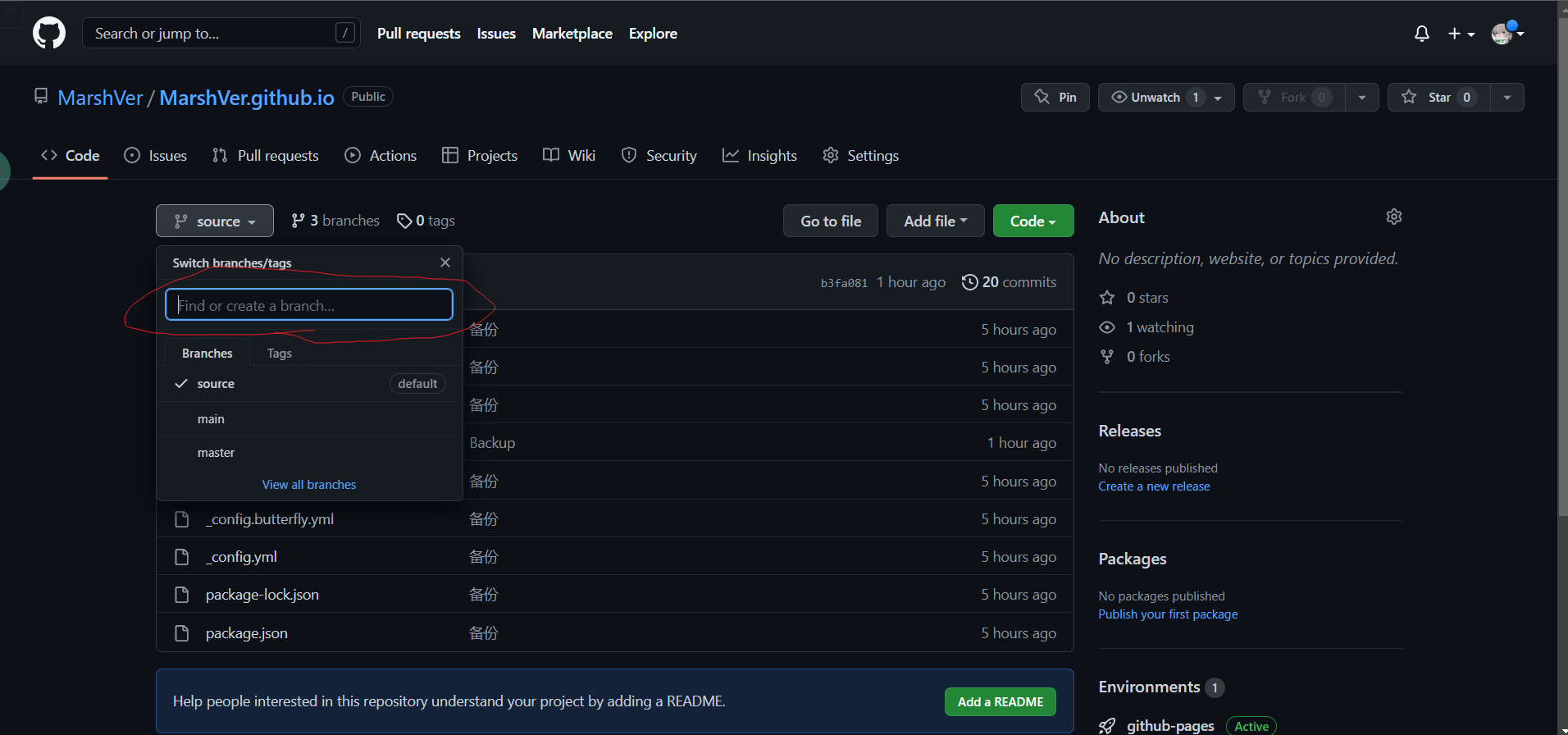这样就备份完博客的源文件,且在Github上能看到两个分支(master和source)。后续备份最后一步只需git push即可。