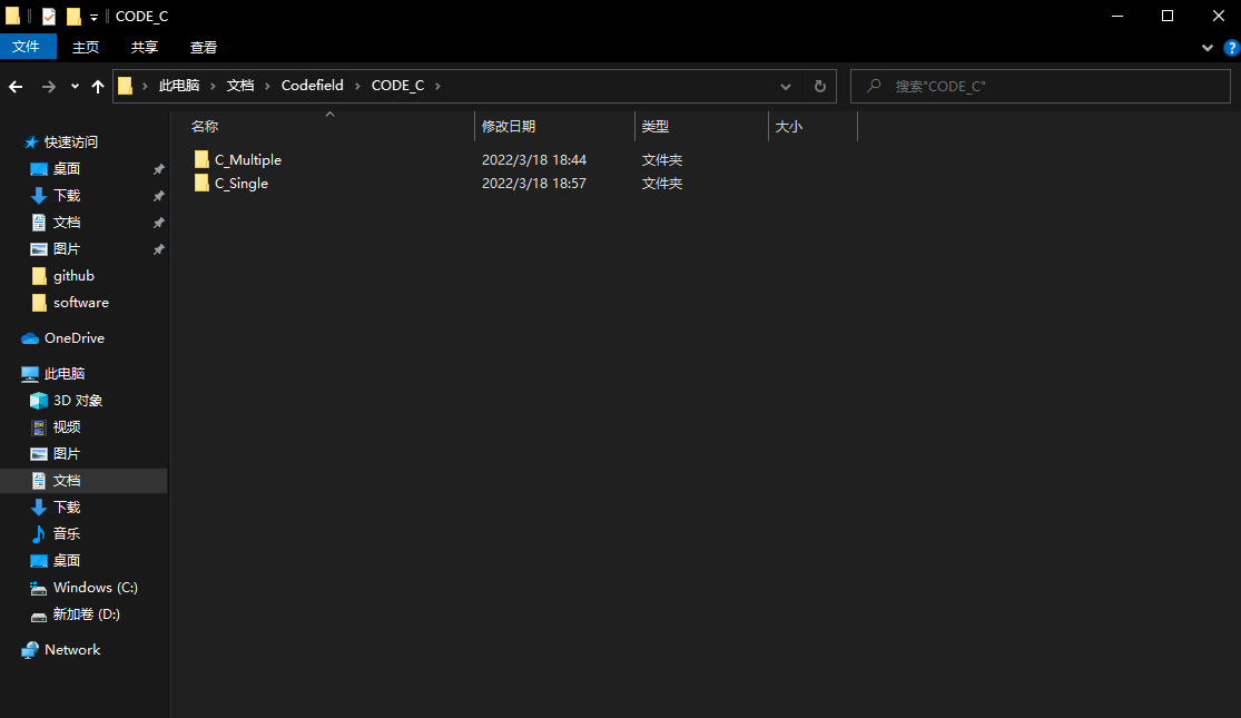 在 CODE_C 文件夹中,你可以创建两个文件夹 C_Single 和 C_Multiple。前面一个可以放单个小项目,后面一个可以放复杂的大项目。